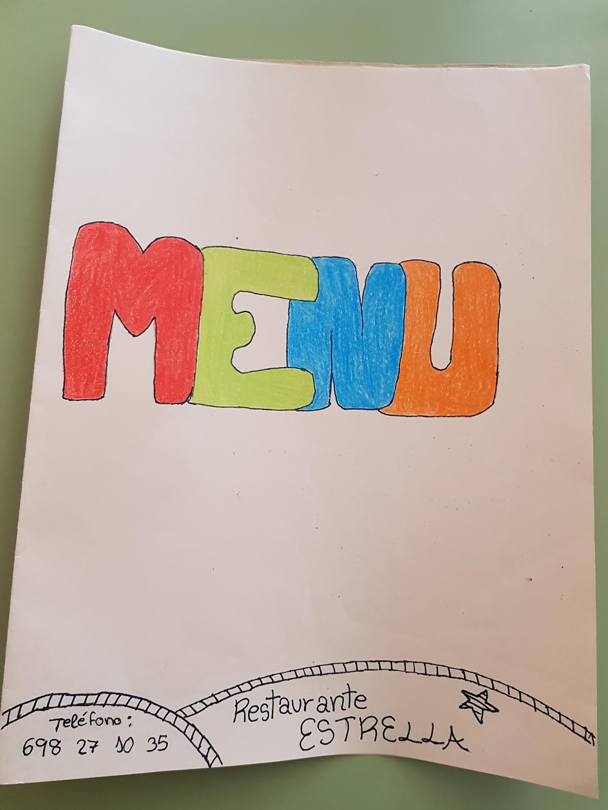 Los alumnos de sexto para ser evaluados en la parte de expresión oral han trabajado en grupos de tres preparando una escena en un restaurante en la cual uno/a de ellos/as es el/la camarero/a y los/as otros/as son los/as clientes/as. Para ello han elaborado el guión de dicha escena, el cartel con el nombre de su restaurante y un menú. Veamos algunos vídeos y fotos.